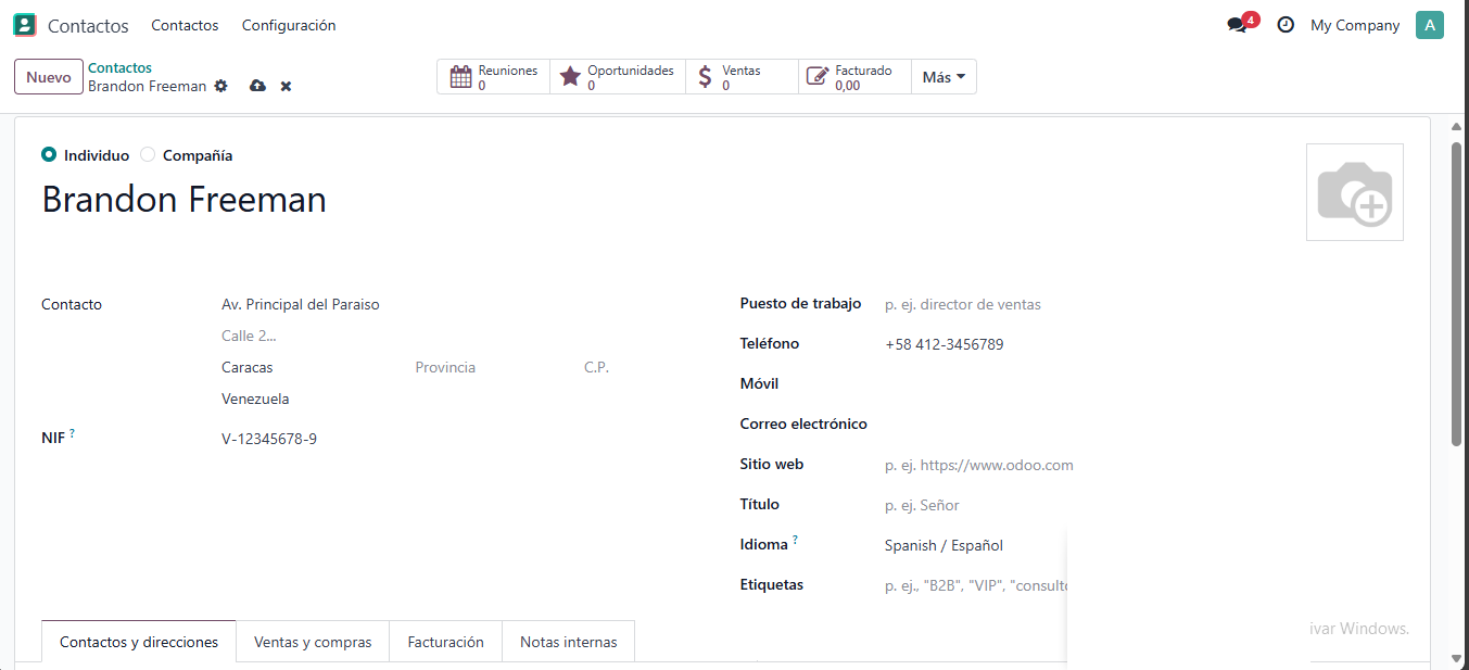 Ahora, completa los detalles del nuevo contacto. Odoo te ofrece mucha flexibilidad: